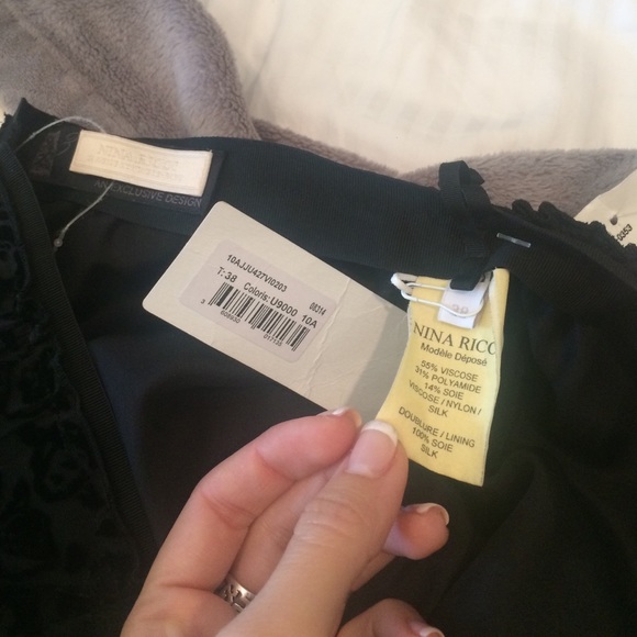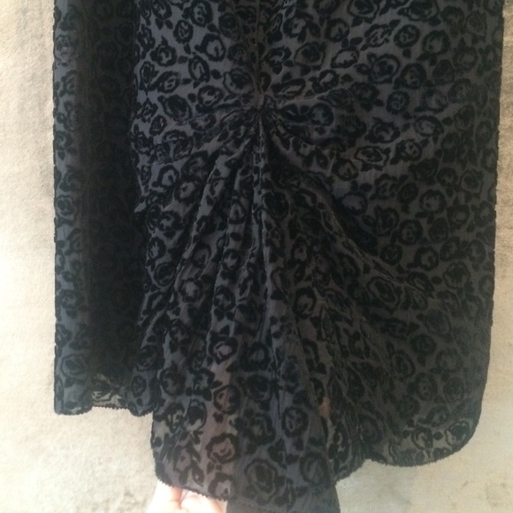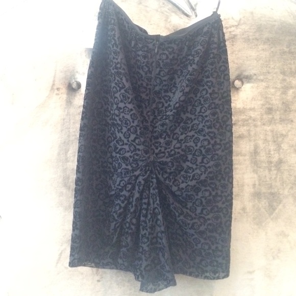 Elegant black silk skirt by Nina Ricci with velvet roses. Sleek and comfortable fit. Bunched in the back at the to form a draped bow like look. Size 38 – fits a small or medium sized 2-6. Made in France. 55% Viscose, 31% Polyamide, 14% Soie. Doublure / Lining 100% Soie Silk.