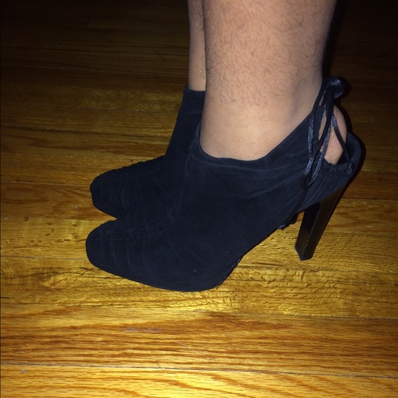 💯 Authentic Black Suede GUCCI BOOTIES with ruching at front, stacked heel and tie closure at ankle moderate wear throughout ❤️👠 No 📦