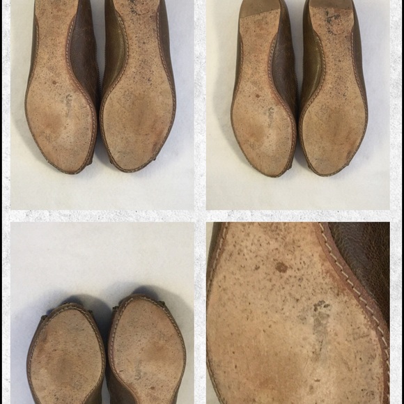 Distressed ballet flats by Alexander McQueen. The color is between an olive green an brown. There’s a zipper that goes around the shoe and adorned with the McQueen skull. These are loved with a lot of live left in them.There are scratches which I’ve tried to show in the photos but they pretty much blend in with the shoes.