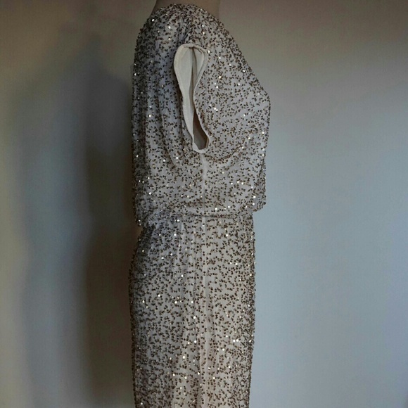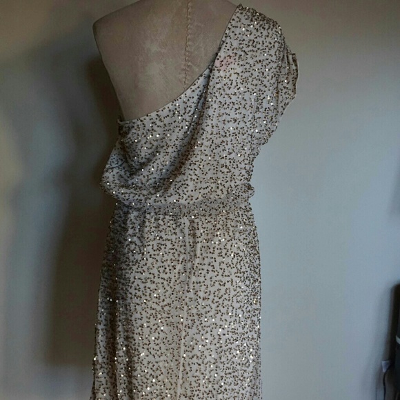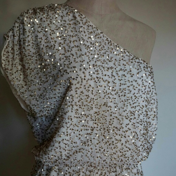 A stunning gold sequined dress by Alice+ Olivia. Light reflecting-spangles festively cover a one shoulder dress cast in a pale hue. Side zip, 35.5 inches shoulder to hem appx. Sold out in stores and in like new condition. It’s a perfect dress for a wedding, party, concert, and more.