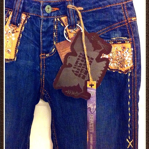 Given as gift by designer from designer -showroom. Style: Fawcett. Low rise, boot-cut, flared bottoms with leather looking embellished Carmel fabric detail on pockets. Whip stitch accents on sides and bottom hem. Size 25