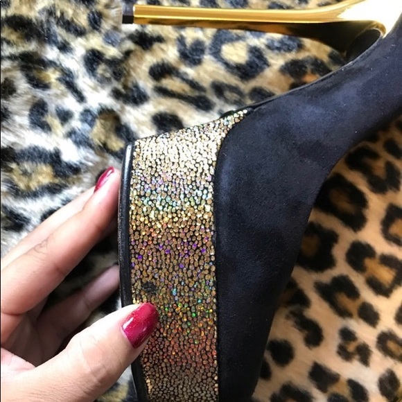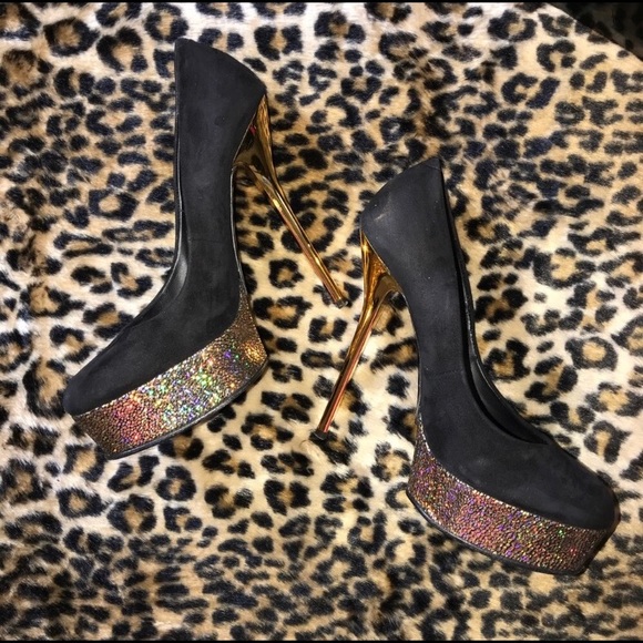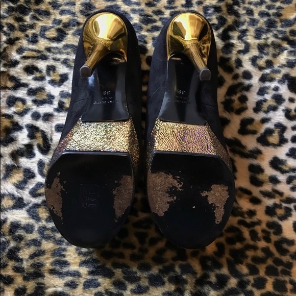 Perfect for Holidays!!! Gently worn, Authentic Black Suede Giuseppe Zanotti Pumps with 5.5″ gold heels and glitter platform. Comes with the original box and suede brush is also included. Please note the small area where the glitter is missing barley noticeable (picture #5)