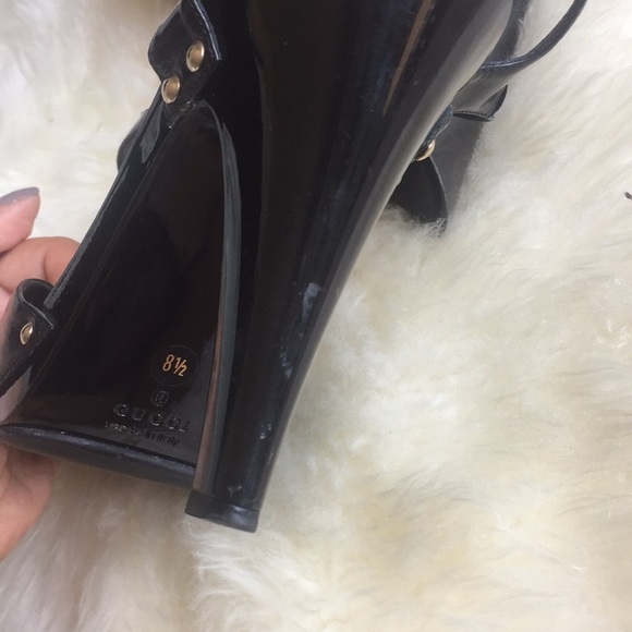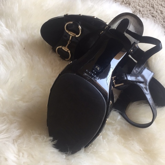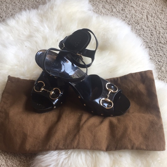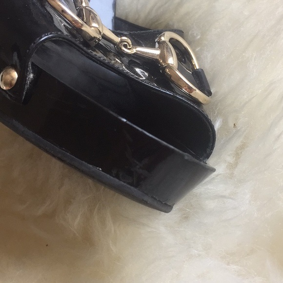 Gucci Patent Leather Horsebit Platform Peep Toe Size 8.5 sandals in black – Worn a couple of times please note signs of wear in the pictures – original dust cover included.