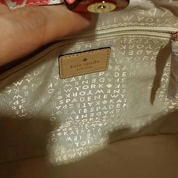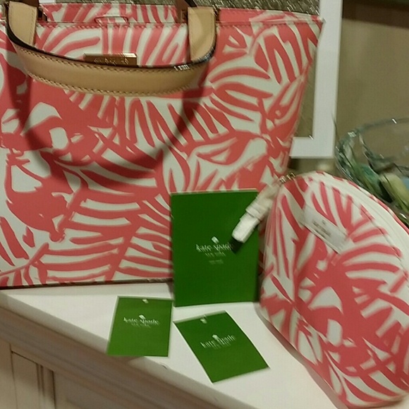 Authentic Kate Spade SMALL Tote bagwith leather handles & Small Cosmetic Bag. New with tags. Set is called Grant Street Grainy vinyl. Bag closes with a magnetic snap. Zipper pocket inside bag. Colors of cream & pink coral. For additional information please ask questions.