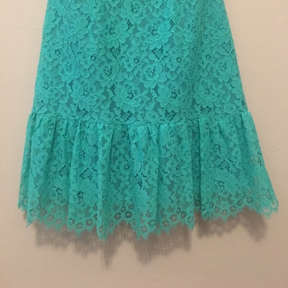 This mint green Shoshanna dress is new with tags and has a ribbed supportive bodice underneath the delicate lace overlay. This would make a wonderful addition to any spring and summer wedding guest wardrobe!