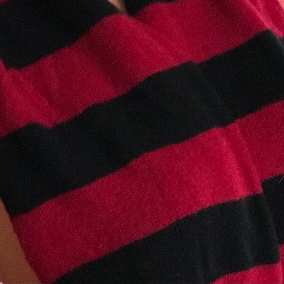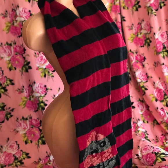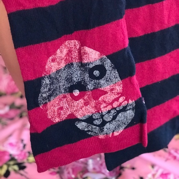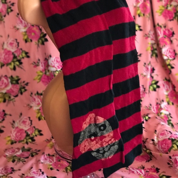 Black and red burgundy with skull (misfits) Steampunk striped 💯% lambs wool soft cozy comfortable not itchy at all!! long scarf wrap warm winter punk gothic style hipster Euro cyber punk rock vintage original Betsey Johnson… pre owned no holes. Kept safe and away from moths! Men or women’s boy or girls unisex non binary