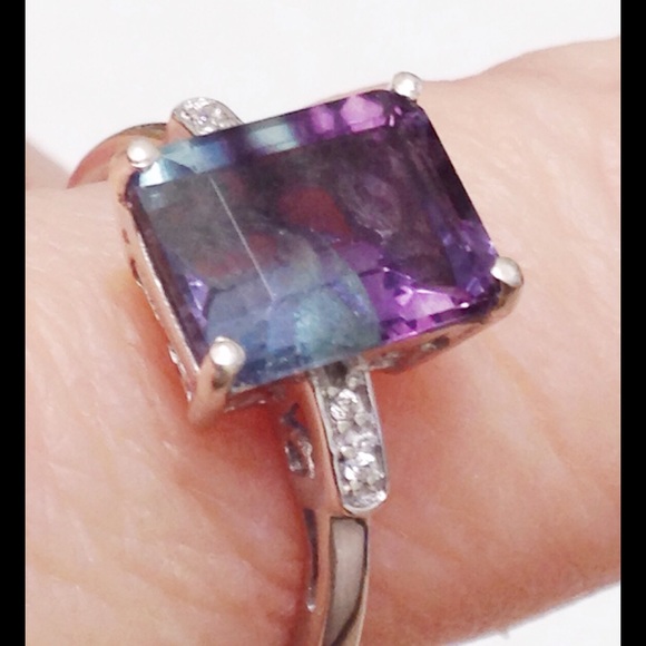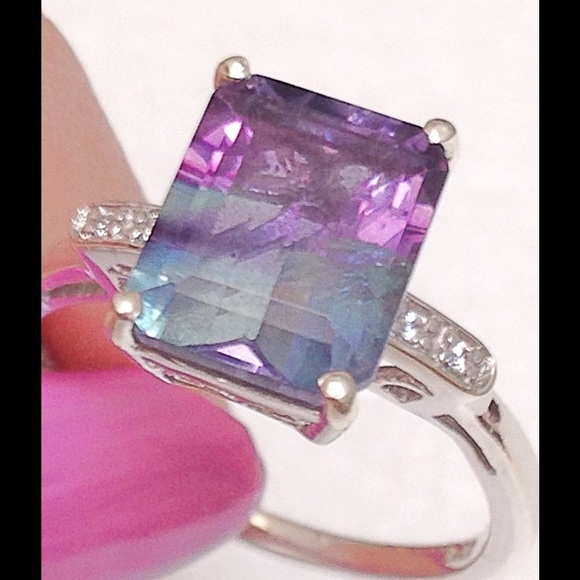 Bi-color Fluorite, White Zircon Ring features a Octogon 6.15 Ct gem accented with the oldest gem in the world, White Zircon. Ring is in Platinum Overlay .925 Sterling Silver Nickel Free (Size 8.0) TGW 6.190 CTs. Color Change Fluorite displays blue, turquoise or blue-lavender, transitioning to intense blue or blue-green and has been called one of the most colorful minerals in the world. Many countries produce Florite but the best blue variety is from China where this gem was mined. Natural