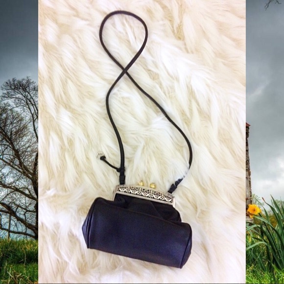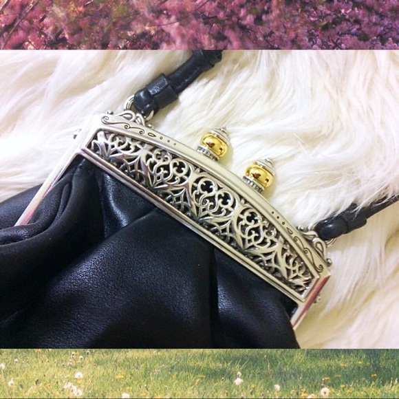 This is a very unique & striking cross body crafted by Brighton. It is pure class! & has stunning beautiful deep scroll work on the heavy metal magnetic closer clasp.The clasp itself must weigh 2 or 3 pounds as you can feel the quality! Another thing of note, is that there is engraving on the signature Brighton heart charm which simply says “Brighton.” This purse is ideal for an evening out when you don’t want to carry a large bag.With out this purse had style that will just never age!