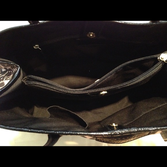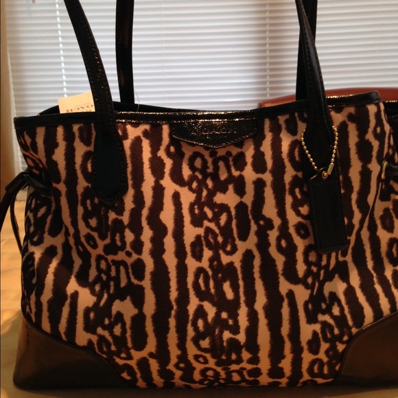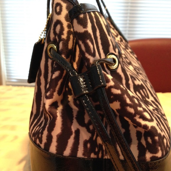 New Coach Signature leopard drawstring CarryAll F31423, Black Multi color. Signature stripe leopard print fabric with patent leather trim. Drawstrings on both sides. Double magnetic snap closures, gold tone hardware. double handle with 7 3/4 drop. Coach leather hang tag, fabric lining. Double zip compartments with zip and slip pockets. 9 (H) x 14 (L) x 6 3/4 (D)