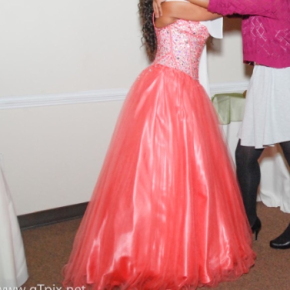 Coral Ball gown made for a princess. Zip in the back top is mesh with beading and has boning. Made out of tulle. This dress was a custom design from the designer. Just lost weight so can’t fit anymore. 😊💕