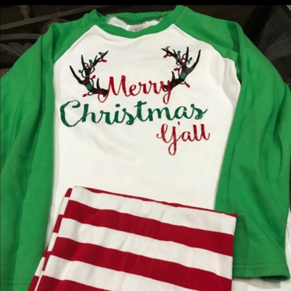 Merry Christmas y’all custom vinyl raglan and striped pants. My sons wore these as pjs. So soft. Once for Xmas morning and once for their pics with Santa. 18 month set and boys size 10 set. Love that cotton brand.