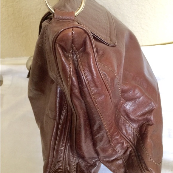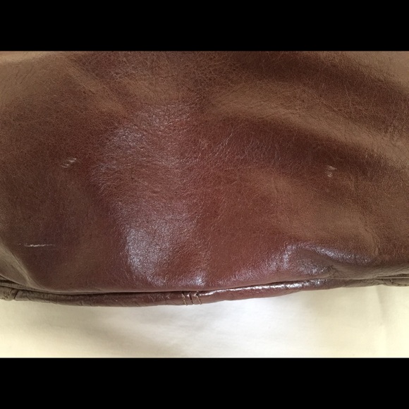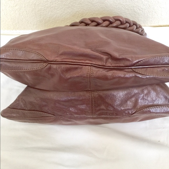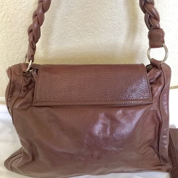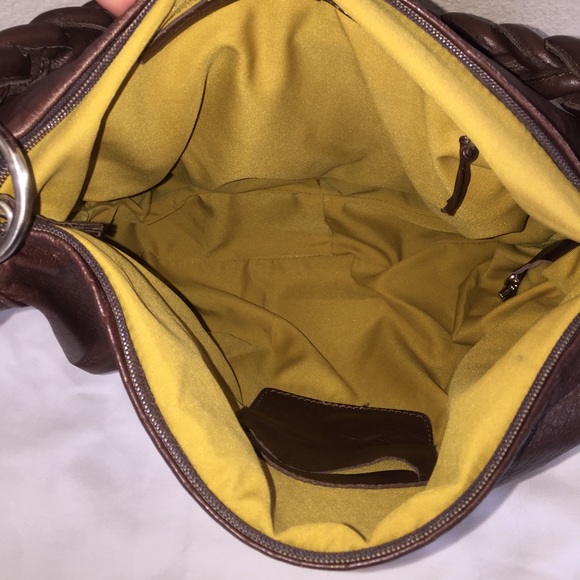Dulce dark brown leather purse with three studs on the front flap, mustard fabric interior, silver hardware and braided handle. Purse comes with cross-body strap. Made in Brazil. Purse can be zipped and snapped to keep it closed. Outside leather has a few small white scuff marks as seen in the last picture. Does not come with dust bag.