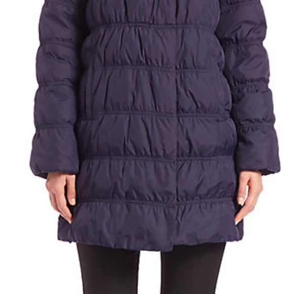 Quilted puffer in streamlined design. Funnel collar. Long sleeves. Concealed snap closure. Zippered slash pockets. About 34″ from shoulder to hem. Nylon. Fill: Down/Feathers. COLOR: Black