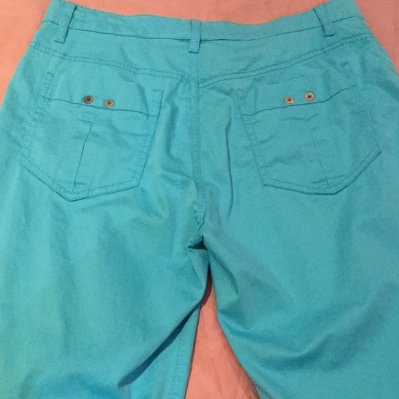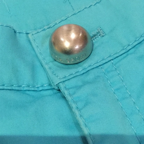 Escada sport, 98% cotton 2% elastin, front and back pockets, very soft cotton. 30″ waist, 10″ inseam, 40″ hips, 40″ total length. Color turquoise
