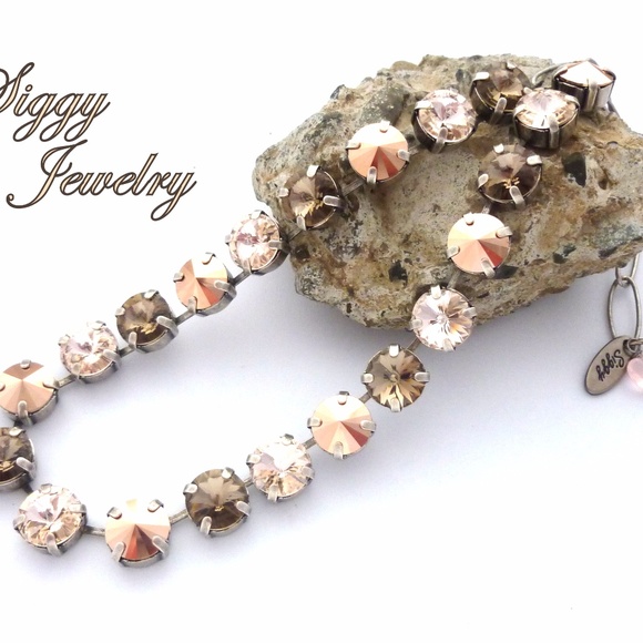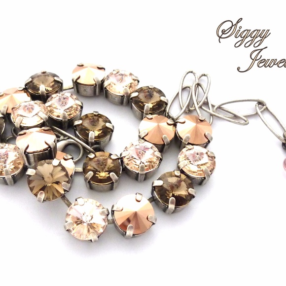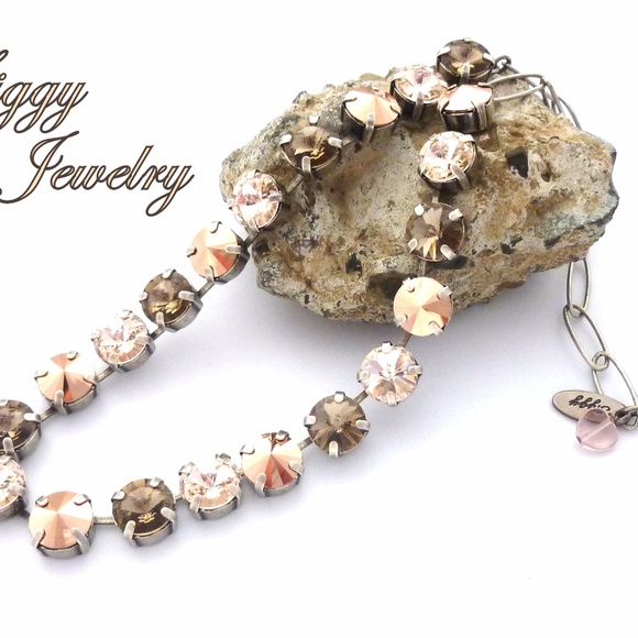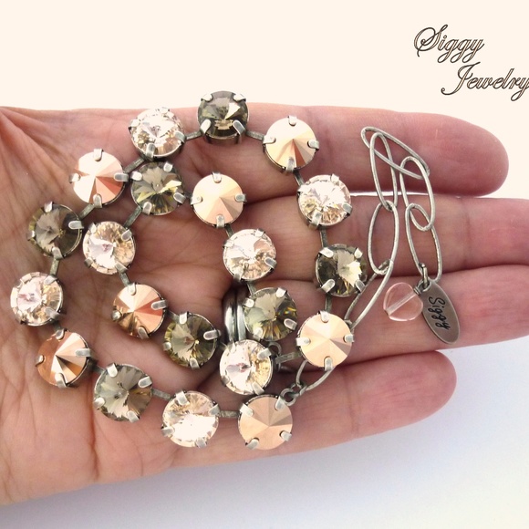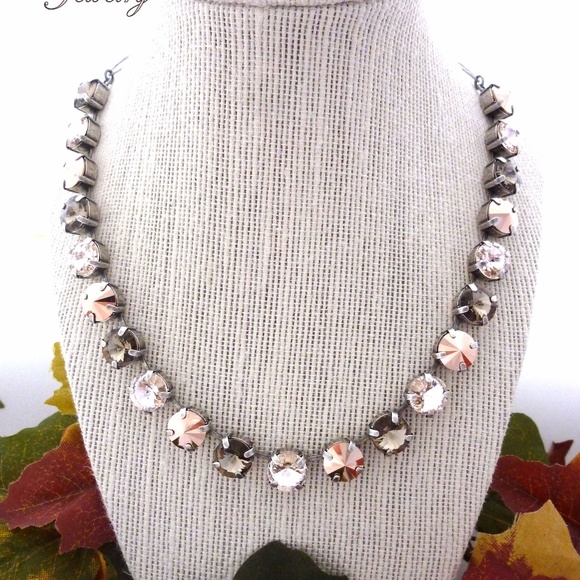 This necklace showcases genuine Swarovksi crystals in neutral tones with metallic rose gold accents. The crystal size is 10mm (47ss). This is a gorgeous stand out piece that is modern and elegant and perfect for every occasion. The necklace is shown in the antique silver finish and is available in other popular finishes. The length is adjustable from 14.5-19 inches. Gift packaging is included. This necklace is hand made with crystals purchased from official Swarovski® distribution partners.