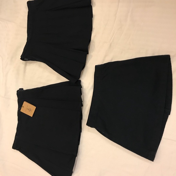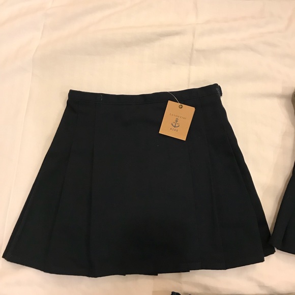 For girls, this set includes 2 long sleeve shirts size 6 gently worn, 1 short sleeve shirt size 5 in good condition, one brand new short sleeve shirt size 6 in package, one pleated skort navy in size 6 in excellent condition, hardly worn, second navy skort size 6x brand new with label, one straight skort size 6 gently worn, one navy dress size 5 in good condition, one navy dress size 6 gently worn, one size 6 navy dress brand new. Tops include custom Apple Montessori logo. All from Land’s End.