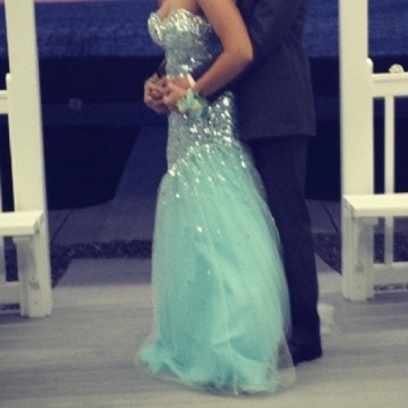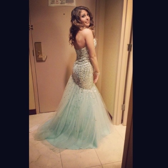 Beautiful Light Blue, Bling Dress. Wore two times – Prom and Miss Teen USA Pageant. Fits like a mermaid around “booty” area and flares at the bottom. Received multiple comments every time it was worn.