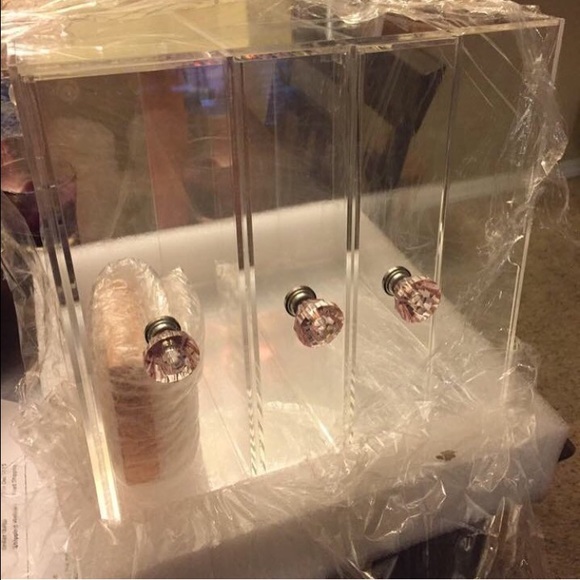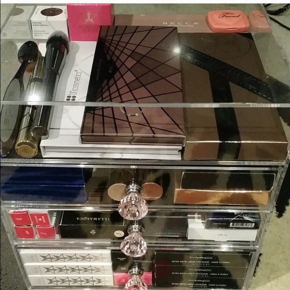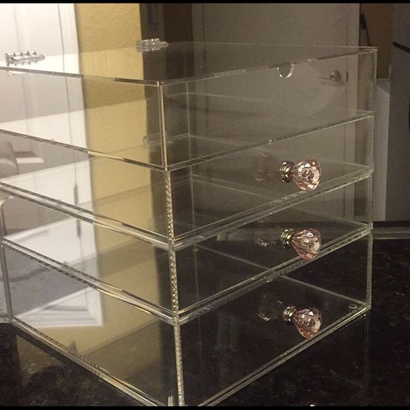 Gorgeous!! A must have for my makeup lovers- My own design these are handmade:-)The dimensions are 10x10x10 The bottom drawer is 3in The middle drawers are 2inThe top drawer that flips is 2 & a half inThe drawers come with slip resistant on the bottom. They are high quality nothing about them reads TJ Maxx. I have several amazing reviews! My inventory is unlimited on these so the price is firm!