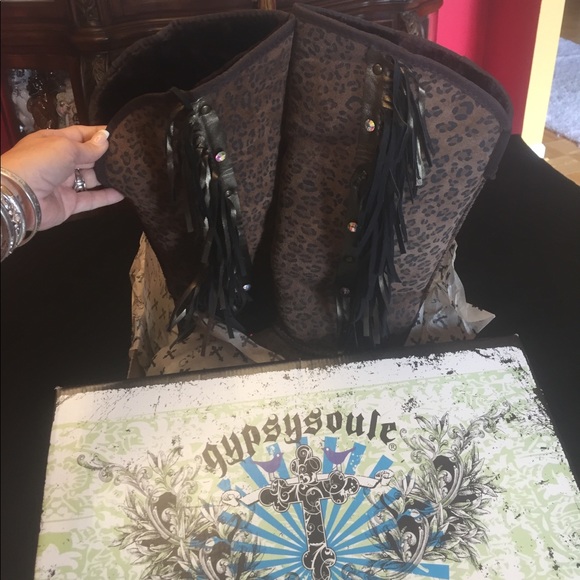 Beautiful Pair of Tall Fringe Brand New In Box Never Worn Gypsy Soule Boots!! Sent directly to me from manufacturer I never wore them.Never had Tags on them because they were never set on a retail floor.All Sparkles& Embellishments were done in the Big State of Texas (made in America) with the finest Italian leathers, hides, and Swarovski Crystals!. Words from Gypsy Soule