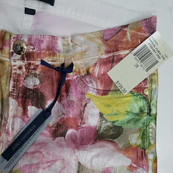 JC Floral coated denim. Measurement:33cm in the knee narrows to28cm at the leg opening,74cm inseam 19cm rise.Material:88% cotton,11% poly,1% elastane.