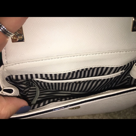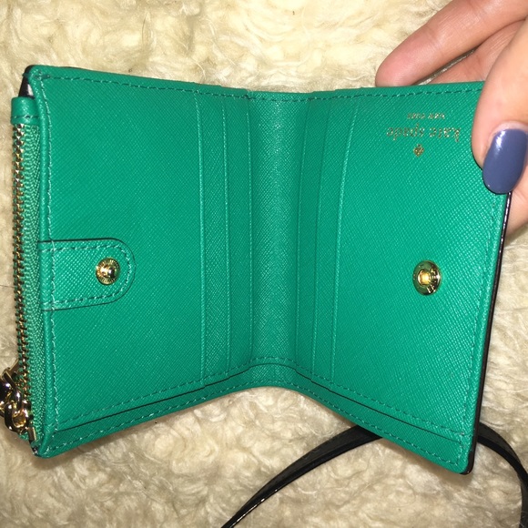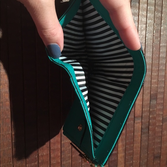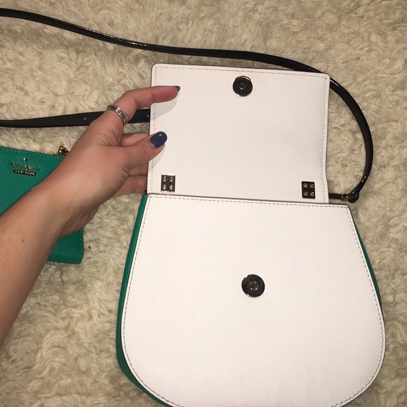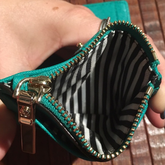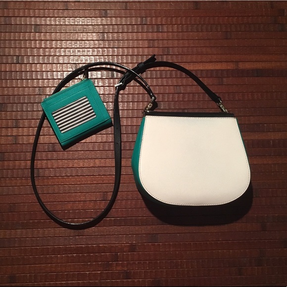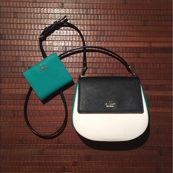 Emerald, white and black, Small Byrdie. Cross body straps drops to 22″. Strap is removable and adjustable. Adalyn wallet Emerald color, 6 interior card slots, bill area as well. Change purse is on the side with zipper closure. Exterior card slot with viewer window. Stripped interior on both bag and wallet. In great condition. Hardly used.
