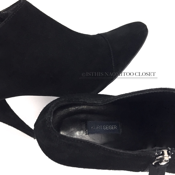 419. KURT GEIGER Made In Italy Black Suede Front Stitched Slim Low Ankle Boot. Black outer-shell, mid front “T” stitching seam, full length side zipper, inner black leather, black leather sole: “VERO…(logo)/ MADE IN ITALY/ 37” embossed. SIZE EUR 37. Slim Heel- ~3.5. USED.(rt and left) outer-shell suede wear: noticeable (rt and left shoe) side wear and spotting, barely noticeable heel discoloration and wear. Noticeable inner leather wear but has been clean to best ability.