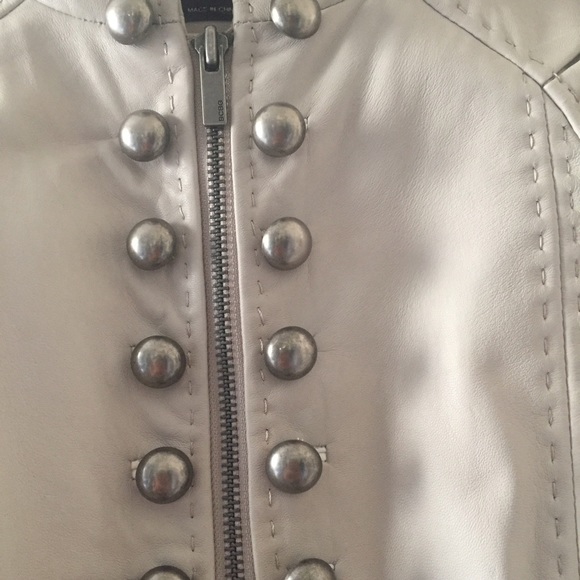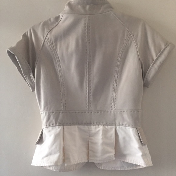 BCBG MAXAZRIA Butter soft lightweight leather short sleeve jacket tapered to form fit with detailed top stitching and waist belt. Zipper and buttons are silver. Contrasting viscose bustle at waist. Color: ”Vapor”. Military inspired style.