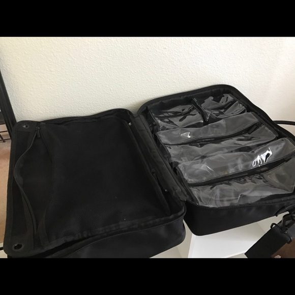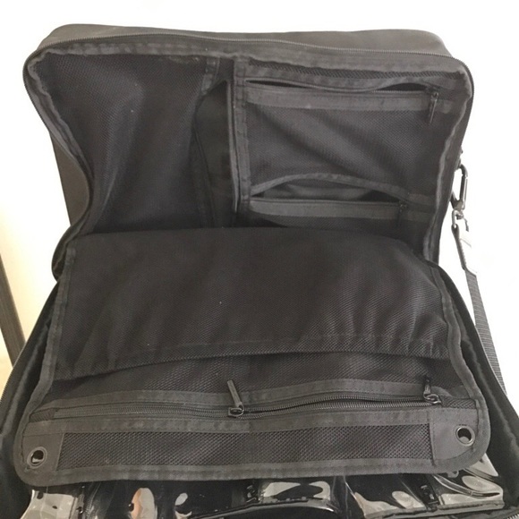Contains three zipped compartments made of mesh fabric on one side and clear, plastic removable bags – two large and two small – on the other. Comes with a removable shoulder strap. Designed to fit on top of the MAC Zuca bag.