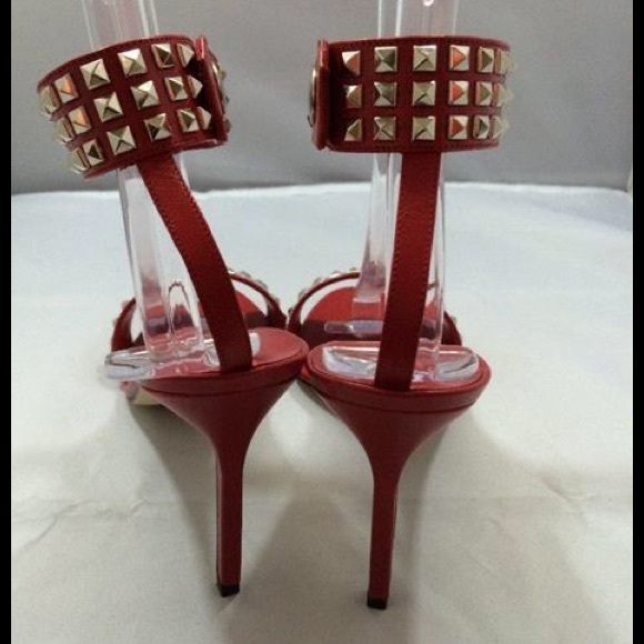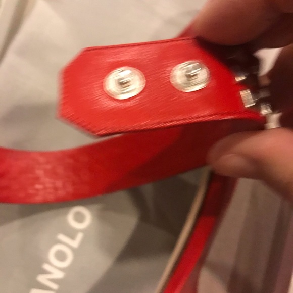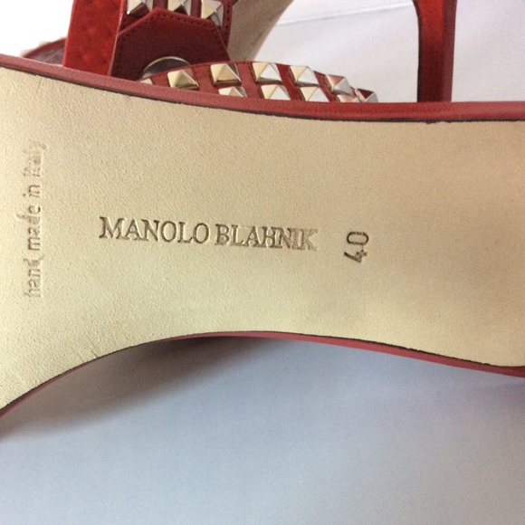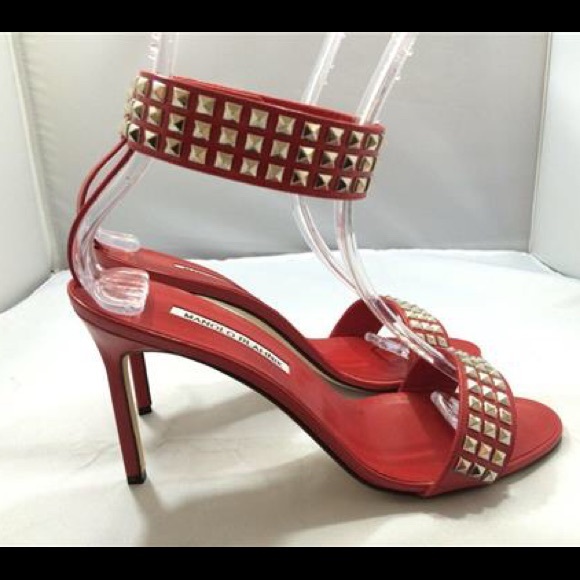 Manolo Blahnik Rocco red studded leather shoe with snap ankle strap and single strap minimal style.The hottest shoe of the season. Comes new in box with dustbagretails for 82590 mm (3.5 inches)