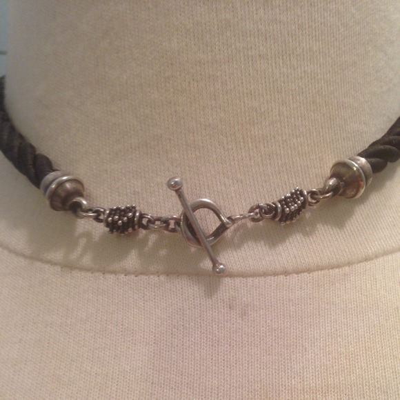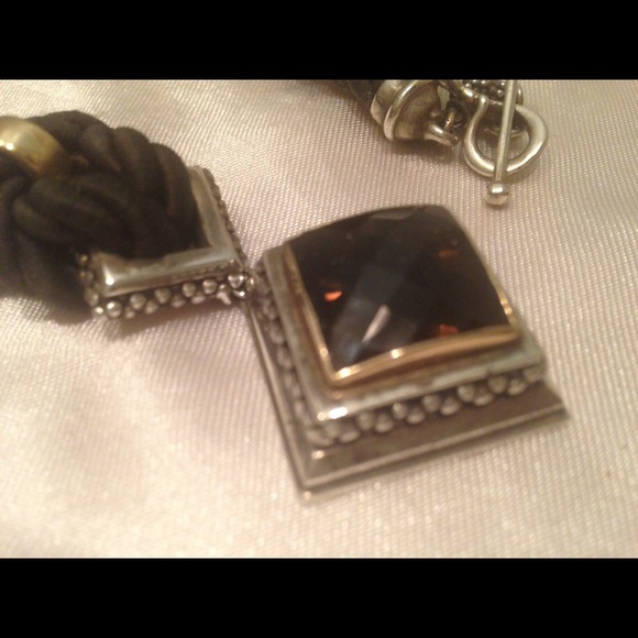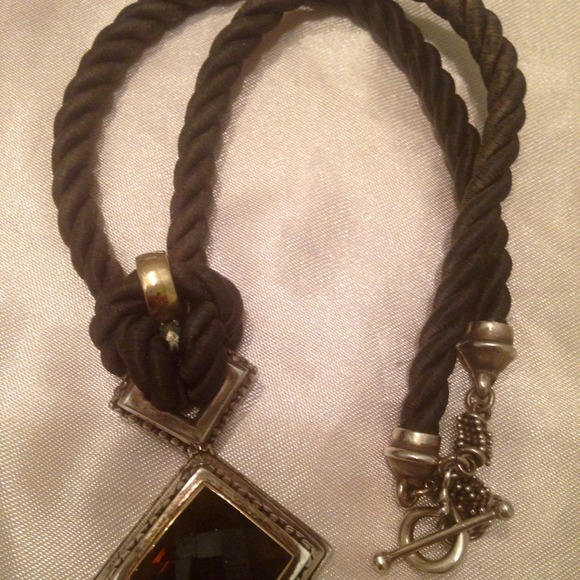 Sterling silver .925. 14K Yg bail. Checker top chocolate brown smokey topaz. Chocolate brown silk cordwith a toggle clasp.