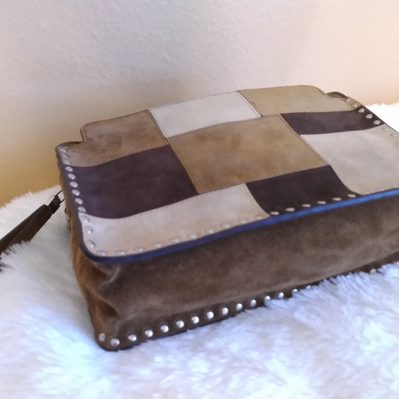Retro-cool patchwork suede elevates the laid-back-luxe appeal of this studded messenger bag from MICHAEL Michael Kors.9-1/4″W x 6″H x 3″DInterior features 1 zip pocket, 1 slip pocket and 1 key finder23″L-25-1/2″L adjustable chain-detail strapTop zip closureExterior features brushed nickel-tone hardware, studs, logo, 2 snap pockets and patchwork designPatchwork suede/leather; lining: polyesterImported