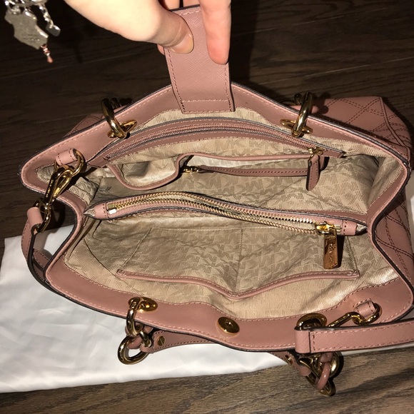 I’ve gotten so many compliments on this purse. The sandy pink color is very unique and the duel compartments inside are very spacious! Love love love this bag. Excellent condition and comes with garment bag 😊