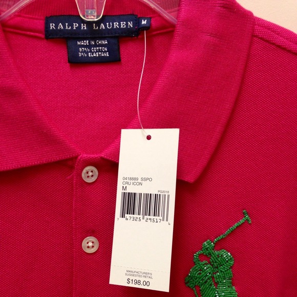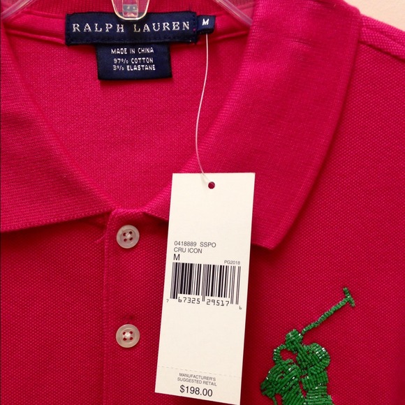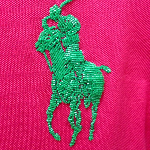 NEW with tagsRalph Lauren blue labelWomen’s polo shirt with beaded ponyPink w/ green pony short-sleeved cotton mesh polo shirtfeatures glimmering beaded signature Big Pony at the left chest.Ribbed polo collarButtoned half-placket.Short sleeves with ribbed armbands.Uneven vented hem.beaded signature Big Pony accents the left chest.100% cottonMachine washable.*if you like this style, I have it several other colors! *I give an automatic 15% discount when you bundle 2 or more items!