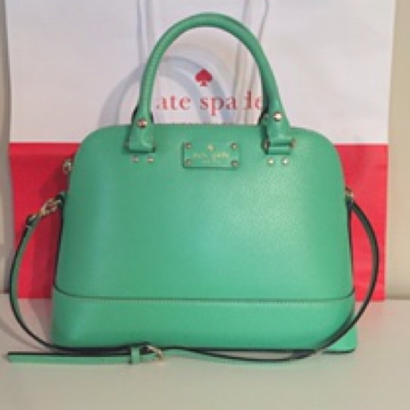 Nwt authentic Kate spade bud green Wellesley small Rachelle and matching neda wallet Purse 10″h x 13.6″w x 5.1″dBoar-embossed leather with 14-karat gold plated hardwareZip top closureCustom woven rainspot liningInterior features zip, cellphone and multi-function pocketsWalletboarskin embossed cowhide with matching trimcustom woven rainspot liningzip around continental wallet12 credit card slots, 3 billfolds, and zipper change pocket; exterior slide pocket3.9″h x 7.6″w x 0.8″d