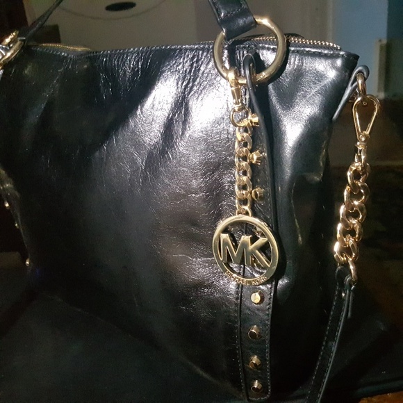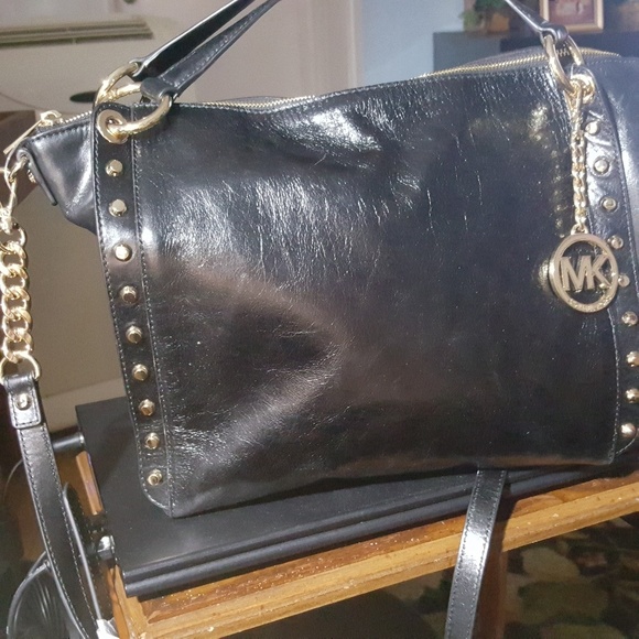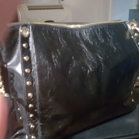 This is a awesome medium-sized leather satchel handbag. It retails for $368 and is brand new.It is like a black patent leather with gold studs, chains, zipper, etc.Please do take a look at my other items I have for sale here onand thanks for viewing folks!