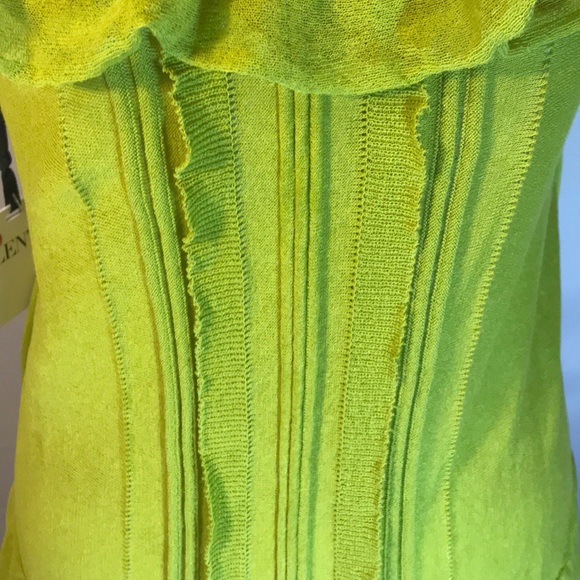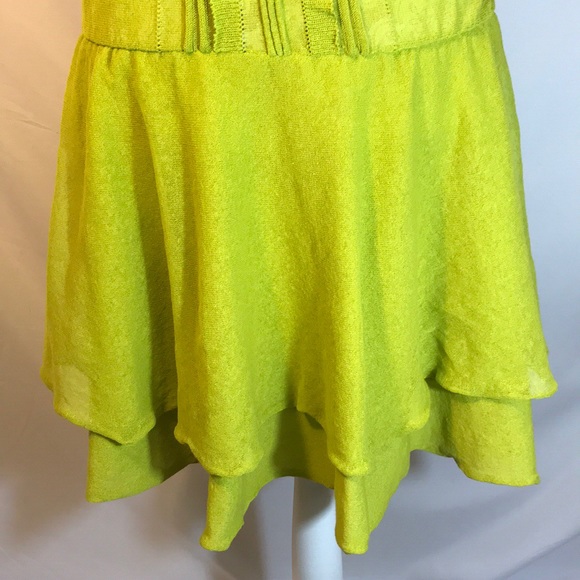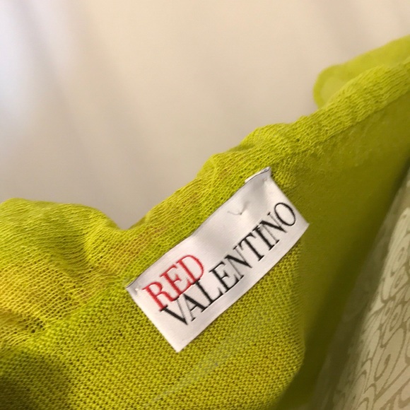 Valentino Red, Cotten blend, loose knit (almost gauze-like) drop waist sundress. Two-tiered ruffle skirt, tank straps and off-the-shoulder ruffle strap/neck line detail. This is a dark lime 🍈 colour, almost 🥑 . It’s great for warm weather & fab for festivals! It also works as a layer, with leggings and/or a body suit. Hand washable. Size Medium, fits like a 6, but would also work on a 4.