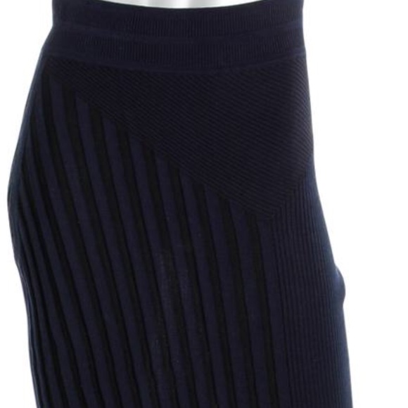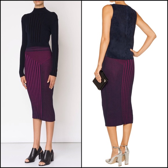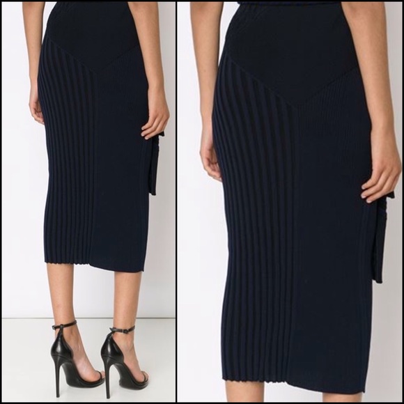 New With Tags.OHNE TITEL Navy & Black Ribbed Colorblock Mid-Calf Pull On Stretch Pencil Skirt**( Does not come with the clothe wrap belt as seen on one model)✳️NAVY BLUE & BLACK for Sale–other colors on models just for show)SIZE: LARGEMFSR: $395.00Total Length: 32″COLOR: Navy/Black61% Cotton/39% RayonStyle Number: OTW103