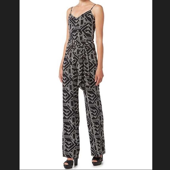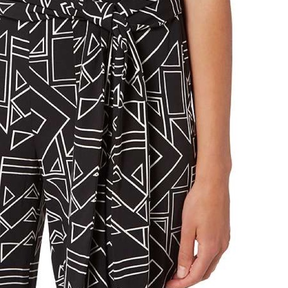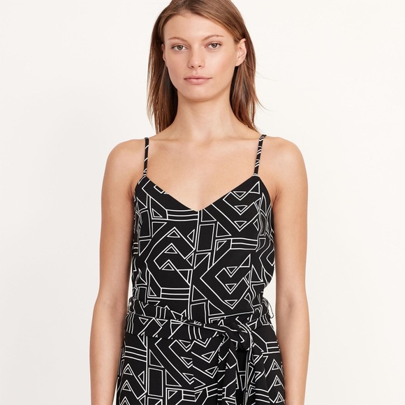 A bold geometric print adds modern flair to this fluid crepe jumpsuit from Lauren Ralph Lauren–the wide-leg style is chic any time of day.Size 0SAMPLE PIECE…. NO REGULAR STORE TAGS•Sleeveless wide-leg silhouette circumference•Approximate 33-1/4″ inseam•Concealed left-side-seam zipper with a hook-and-eye closure•V-neckline•Spaghetti straps•Shaping darts at the bust and back waist•Self-tie waist sash•Fully lined•Shell and lining: polyester•Machine washable•Imported