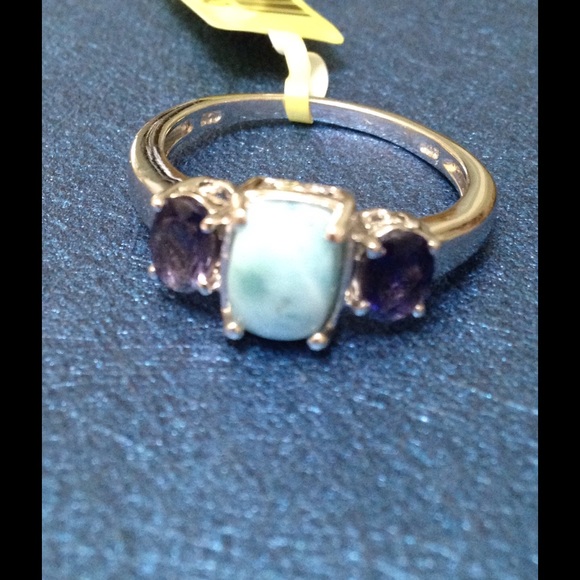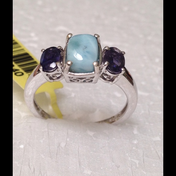 Genuine Larimar Cushion Cut 1.70 CT accented with.85 CT Catalina Iolite. Size 10. Done in Platinum Overlay .925 Sterling Silver Nickel Free. TGW 2.50 CTS. Said to be 20,000 times rarer than diamonds, quality Larimar is a very difficult stone to find because it only comes from one place on earth, 1/3 sq. mile in the Dominican Republic and the mine is almost depleted. Larimar is natural no enhancement of any kind. Partnered with beautiful Iolite to really enhance the presentation.