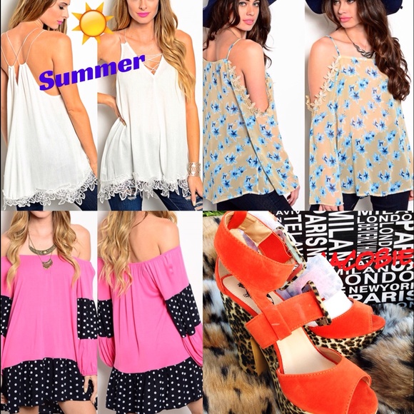 See original listings for details. Whole bundle price is $249. First half 6/17 and 2nd half 7/1. $136 $ $113 respectively. Buyer requests to be surprised by which items arrive in each shipment. 😉😍 CCO discount, bundle, and return buyer perks included. Sizes as follows: Ombré shorts in Lg.Turquoise and hot pink. Off shoulder tunics both in size small. Pink & black polka dot dress in small. White summer breeze lacy tank in medium. Leopard shoes in size 6. Floating petals floral top size large.