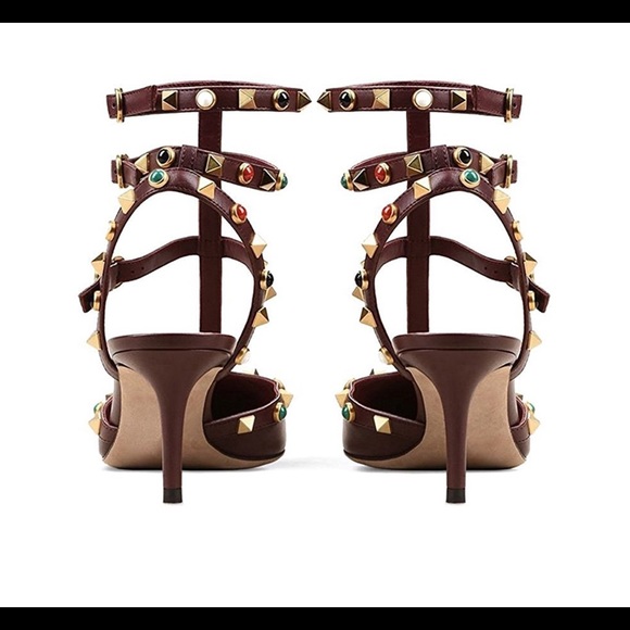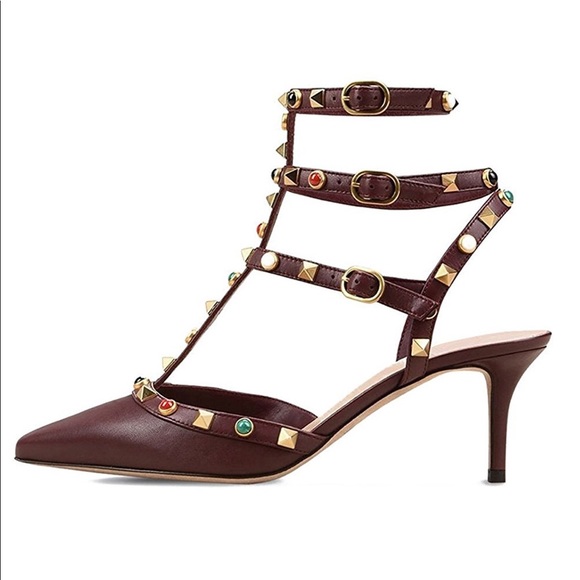 Sexy, sophisticated with colored stones. Heel height is 2.63 cm. These shoes are custom made. Color dark red or plum.