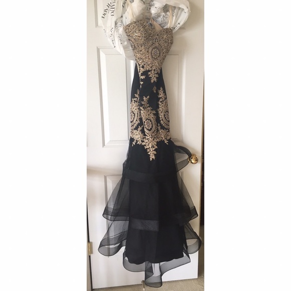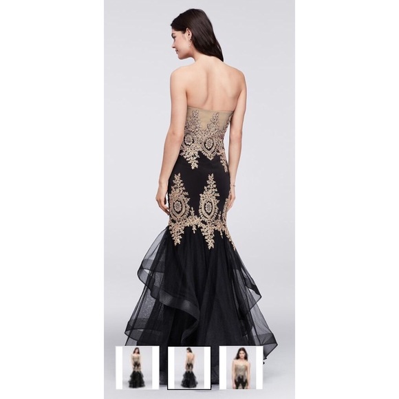 Bring glitz and glam to your big night by slipping into this boldly embroidered sweetheart gown. The tiered tulle mermaid skirt provides a voluminous contrast to the curve-hugging bodice. Also brand new never worn, tags still attached.