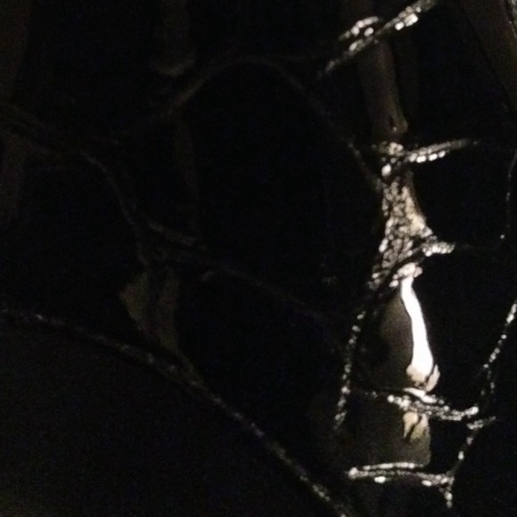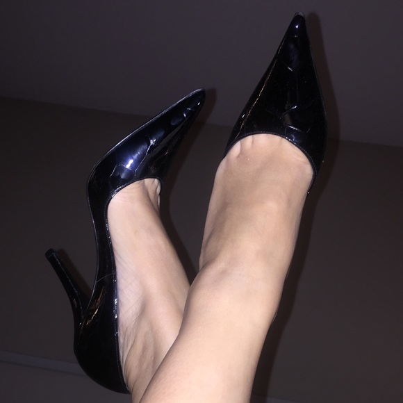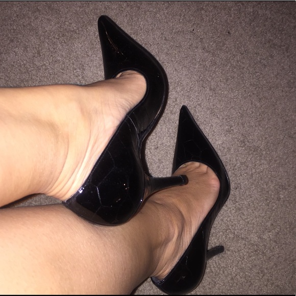 – Worn once- Color: Black,- Croc stamped patent leather upper,- Pointed toe,- Leather lining,- Leather sole with rubber inset at toe,- 4” covered heel,- Made in Spain