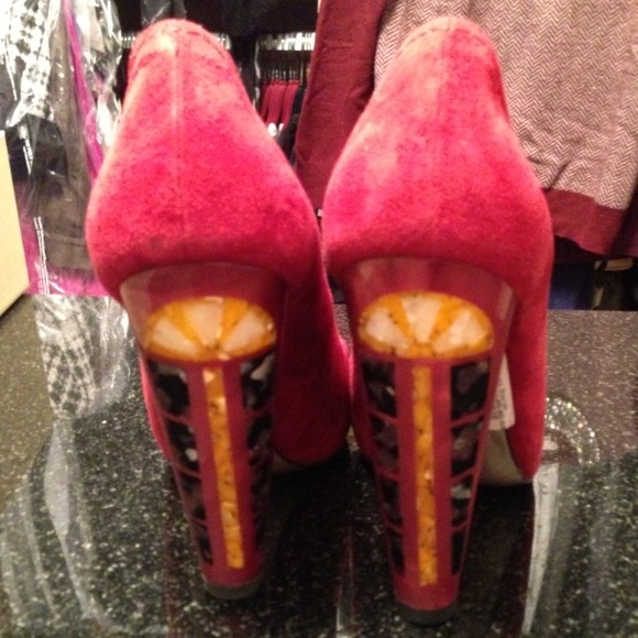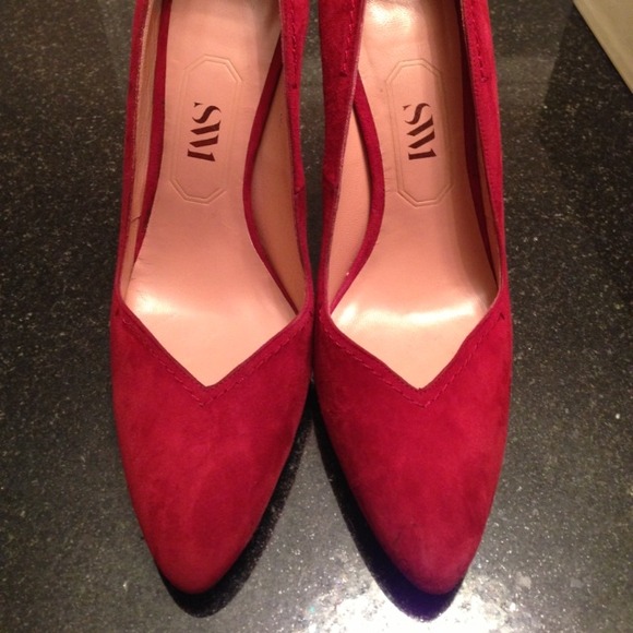 This pump, the “Scallopini” is by SW1, Stuart Weitzman’s high end line. Jewelry-like, mosaic-detailed mother of pearl heel. Suede upper. 4 3/4″ heel with mosaic-inlaid plexiglass; 3/4″ platform, 4″ equivalent. Scalloped collar with tonal top stitching. Low-dipped, V-vamp lengthens legs. Pointed toe. Leather lining, padded insole and metallic outsole. Made in Spain of Italian materials. Worn once for 4 hours. Includes original box. Sz 6M.