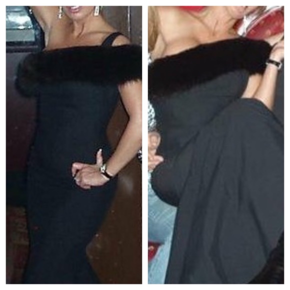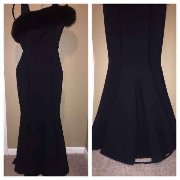 STUNNING ONE OF A KIND DESIGNER GOWN. Price is FIRM. Worn once. One remove able shoulder strap, fur across chest, hidden zipper back and flare bottom. I was a 36C, 5’6 and 135 when I wore the dress and it fit perfect! Main photo is NOT the dress but shows you how it fits. 17 across chest but has a little stretch, length from arm strap is 59″, length from chest 53″, Waist is 13 – 14 across. Size tag unavailable but it’s a size 6. Mermaid style.