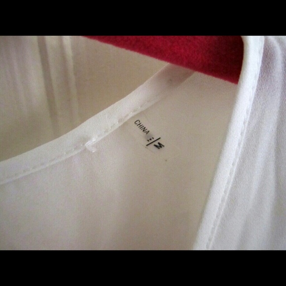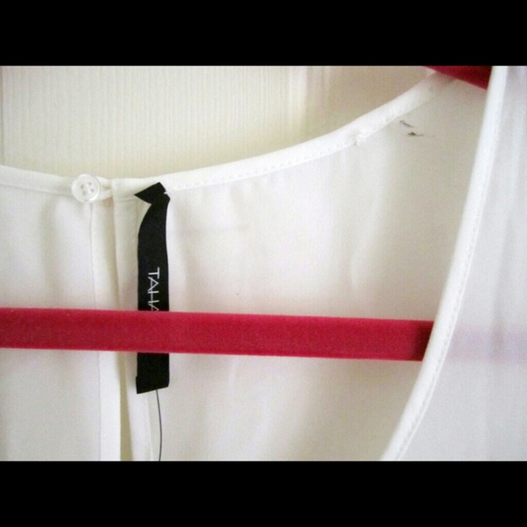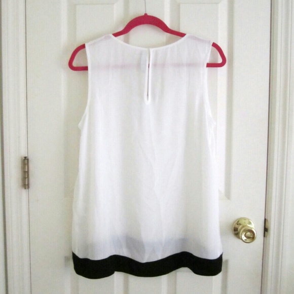 Tahari top with black hem. Button closure on back. This is new but one end of the label is unattached somehow. You can see it in the pictures above.
