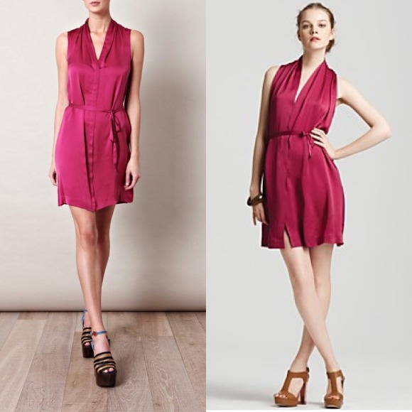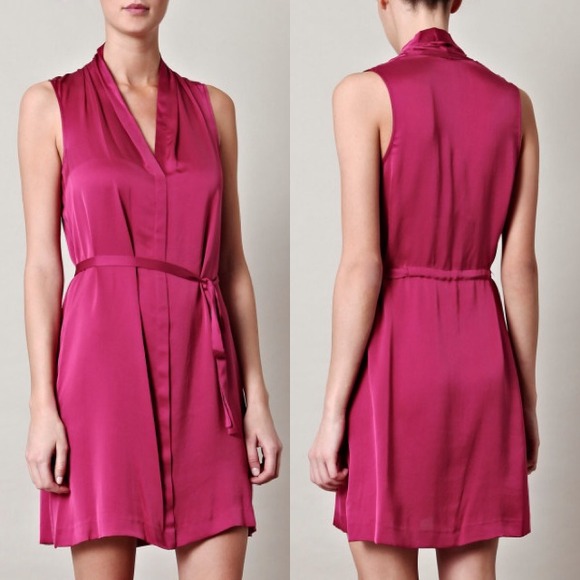 Theory Dress – Imishra PoignantThis raspberry-pink silk sleeveless dress has a ruched V-neck and a hidden buttoned centre-front with a drawstring waist belt. 100% silk. Dry clean.