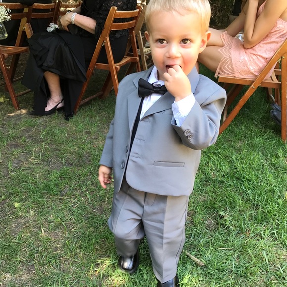 This is a full toddler suit including black shoes, grey pants/jacket/vest/tie, white tuxedo suit, black suspenders and black bow tie.