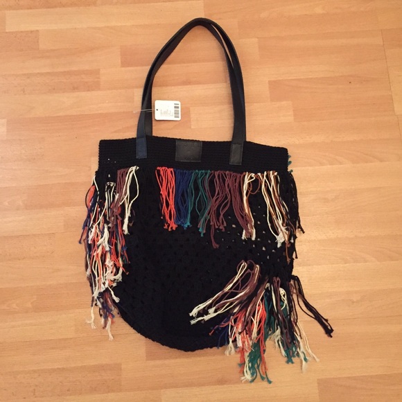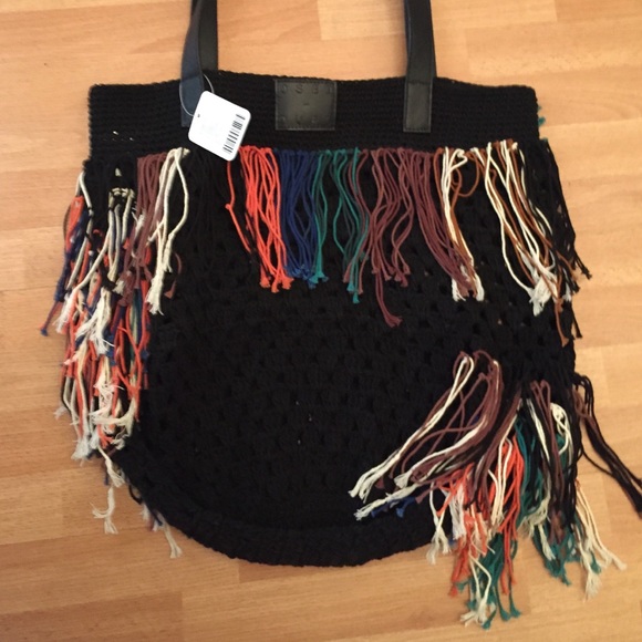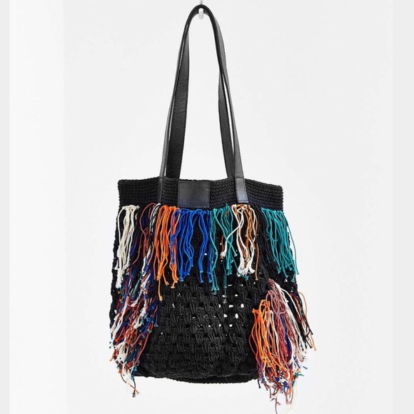 Urban Outfitters Boho-chic macramé tote bag, hand woven by the artisans at Osei Duro, just for UO. Topped with fringe trim along the front and double leather carry straps. Osei Duro produces textiles and garments in Accra, Ghana, applying traditional weaving + hand-dyeing techniques, while supporting the local apparel industry in becoming sustainable.Content + Care- Cotton, leather- Dry clean- ImportedSize- Length: 18″ – Width: 16″- Height: 16″ Brand New With Tag
