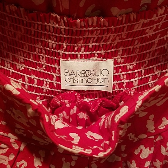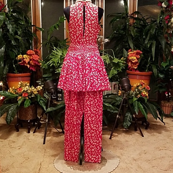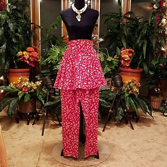 A vintage 2 piece peplum pants and top set (by Barbiglio Christina & Jan), pre-owned in excellent condition. (Never worn by me.) TOP: Length 26″, armpit to armpit 17″, back opening 14 1/2″. PANT: leg 40″, lying flat waistband length 5″, waist 13″,ruffle length 13″ hips roomy 24″. There are two invisible side pocketsand a side zipper closure. 100% cotton.Accessories not included. Offers welcomed.L112